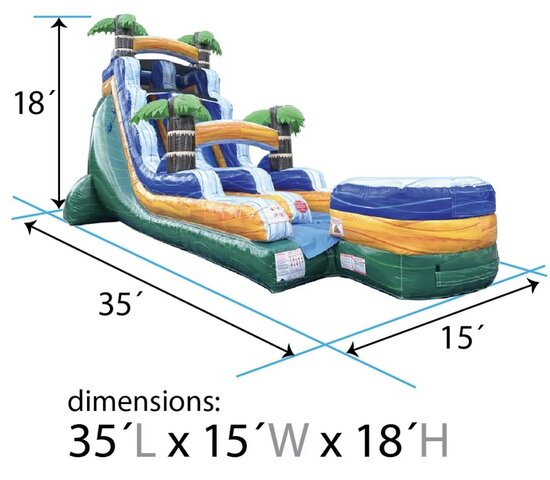 Dazzle kids and parents at your next big event with the 18' Tropical Green Marble Inflatable Water Slide. This 18' tall inflatable water slide stretches out to 35 feet in length for some big-time thrills and a whole lot of excitement. With its gender-neutral colors, this versatile inflatable can be employed for an all-boys or all-girls event, allowing for the potential to double your return on this investment! Try out this inflatable slide on a cool day without water for some fun and entertainment or simply connect a standard garden hose to the built-in misting system and dive into some refreshing relief from the summer heat! All of our inflatable wet / dry slides were designed with children's safety at heart, featuring an inflated landing zone with built-in drains that keeps the water level low enough for a good time, but safe enough for kids of all ages.